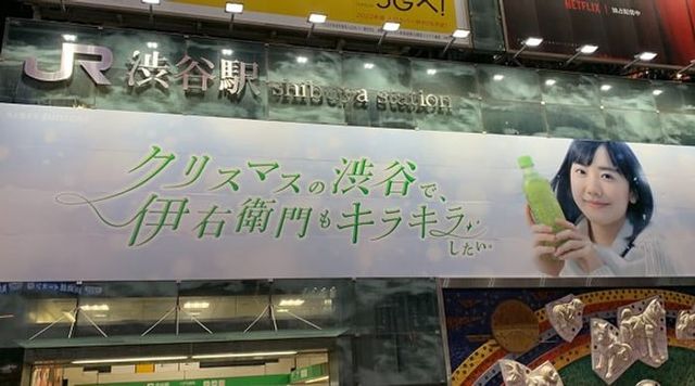 サントリーの緑茶飲料「伊右�normally門」がJR渋谷駅前の大型屋外看板に広告を掲出しました。CMに出演する芦田愛菜さんを起用し、「クリスマスの渋谷で、伊右衛門もキラキラしたい」というキャッチコピーで、渋谷駅利用者に訴求しています。