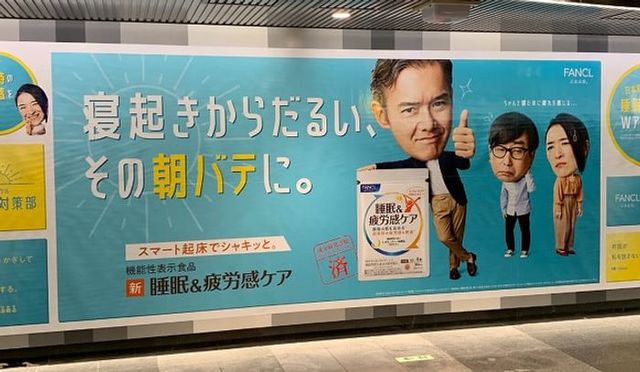 ファンケルは、機能性表示食品「睡眠&疲労感ケア」の新イメージキャラクターに渡部篤郎さんら3名を起用し、東急田園都市線渋谷駅構内で駅貼りポスター広告を展開しました。「朝バテ対策部」というコンセプトで、共感を呼ぶ「朝バテあるある」とキャラクターのコミカルな表情を組み合わせた広告となっています。