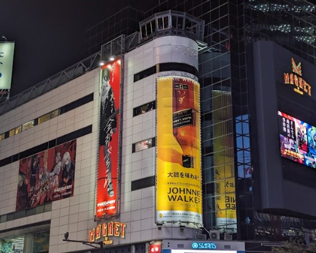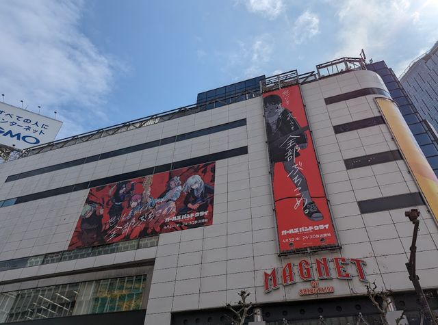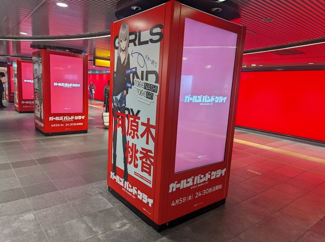 例えば今週展開された「ガールズバンドクライ」は赤をベースにしたクリエイティブが印象的で、渋谷駅地下には真っ赤にラッピングした柱サイネージ、横長ビジョンのジャックと空間全体を抑えた展開が特徴的でした。また、渋谷MAGNET壁面でも同時展開しながら、屋内・外で露出を高めていました。