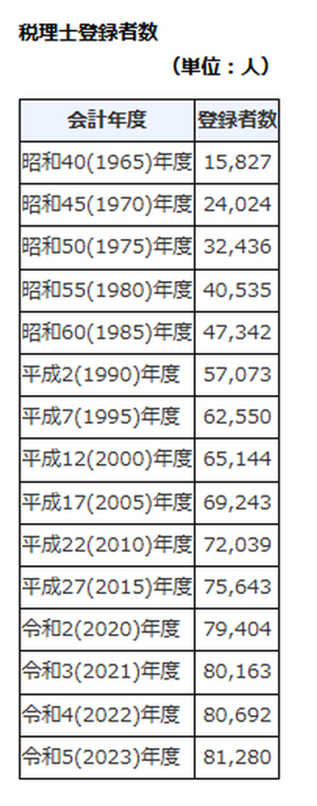 税理士の数は、令和5年度末で81,280人と増加傾向にあります。