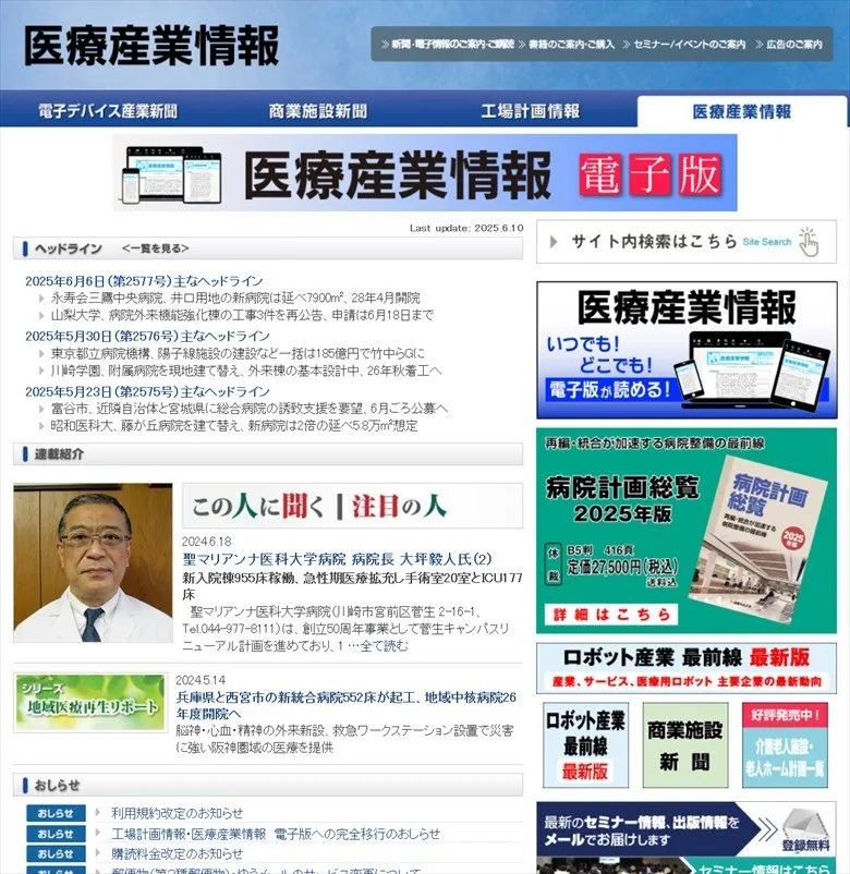 「医療産業情報 WEB版」は、病院の整備計画や介護施設・老人ホームの整備計画を速報する電子週刊紙「医療産業情報 電子版」のホームページです。バナー広告枠をご用意しています。