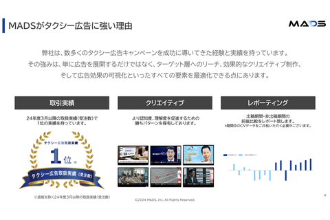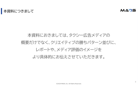 本資料では、タクシー広告の最新事情から出稿におけるポイント、考え方などタクシー広告における情報が網羅できる内容が揃っています。