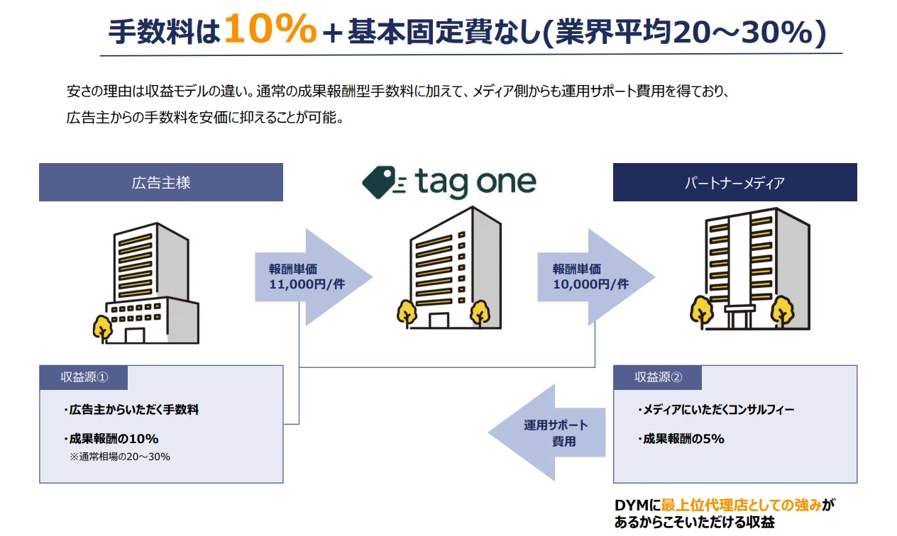 株式会社DYMが提供する成果報酬型広告運用サービス「tag one」は、国内トップランクの認定広告代理店が運営するASPです。
