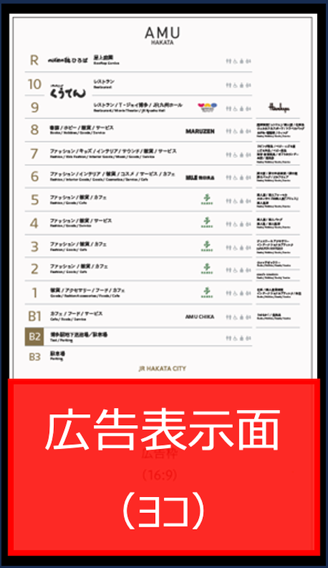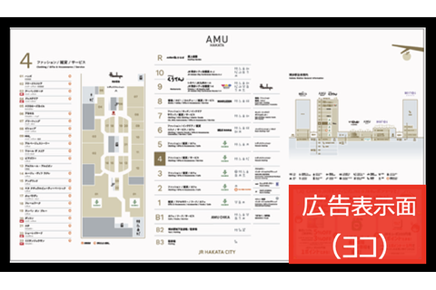 新商品として「JR博多シティ 館内サイネージ(フロアサイン用サイネージ)」が登場!JR博多シティ館内に設置されているフロアサインの画面の一部に広告を放映できる商品となっております。