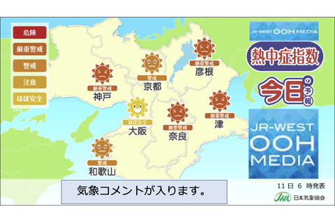 JR西日本、関西路線の車両内で掲出する車内ビジョンのセット広告です。誰もが気になる天気予報の提供として広告掲載します。