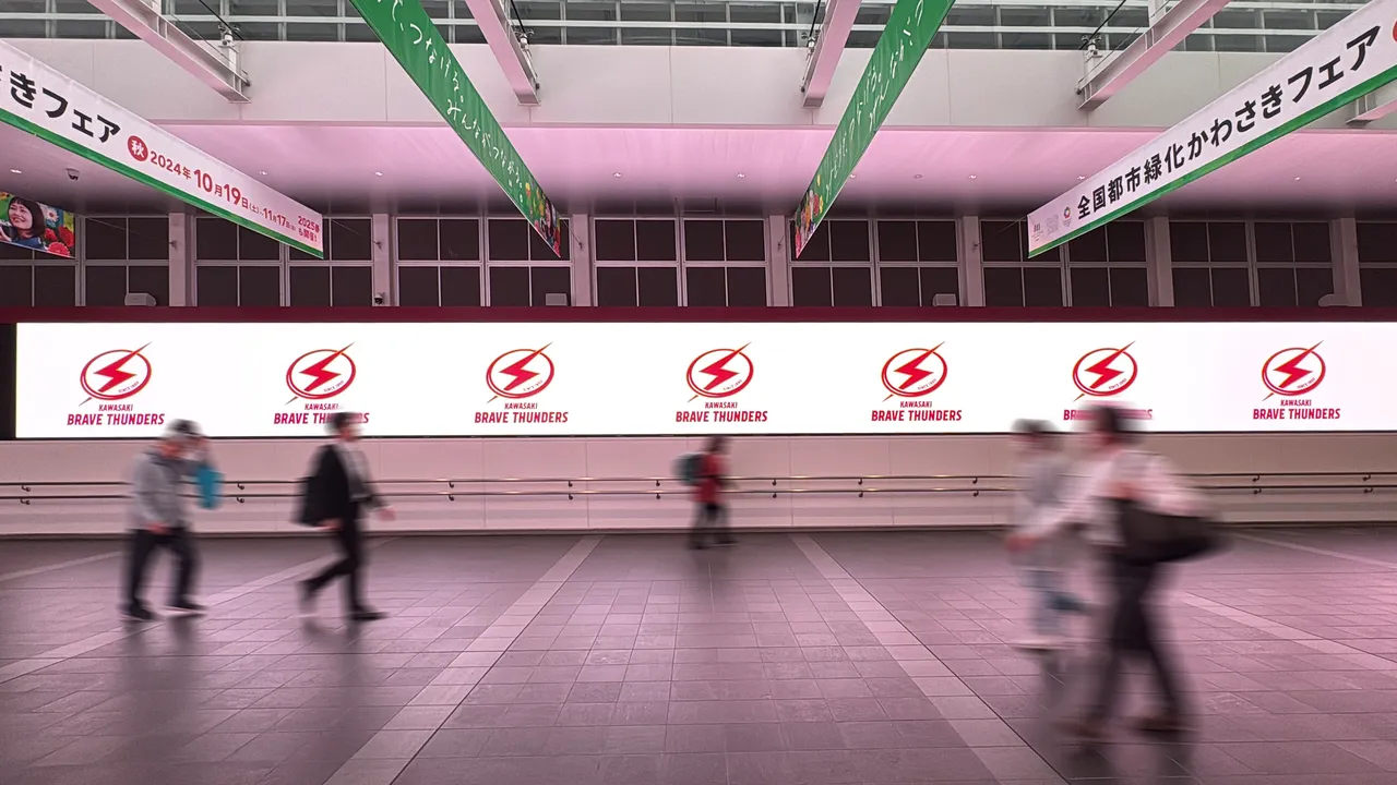 JR川崎駅の北口通路に位置する、24mと12mの巨大な対面式LEDビジョンです 。圧倒的なスケール感と高精細な映像により、通路全体を広告の世界観で包み込む「空間ジャック」を可能にします