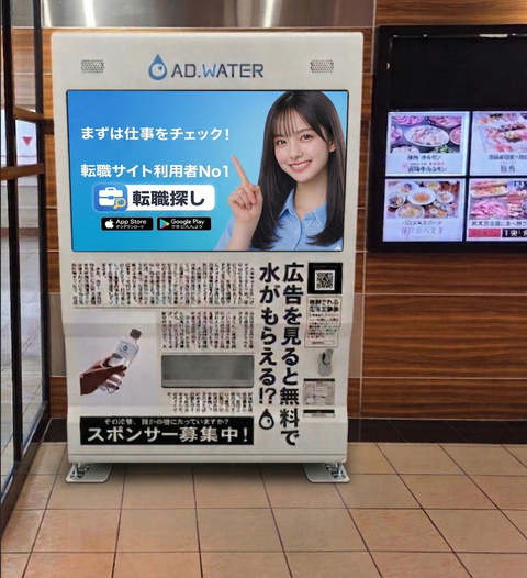 ADWATERは、「広告を見ると無料でミネラルウォーターがもらえる」50インチの大型デジタルサイネージ搭載の自動販売機型オフライン広告メディアです。